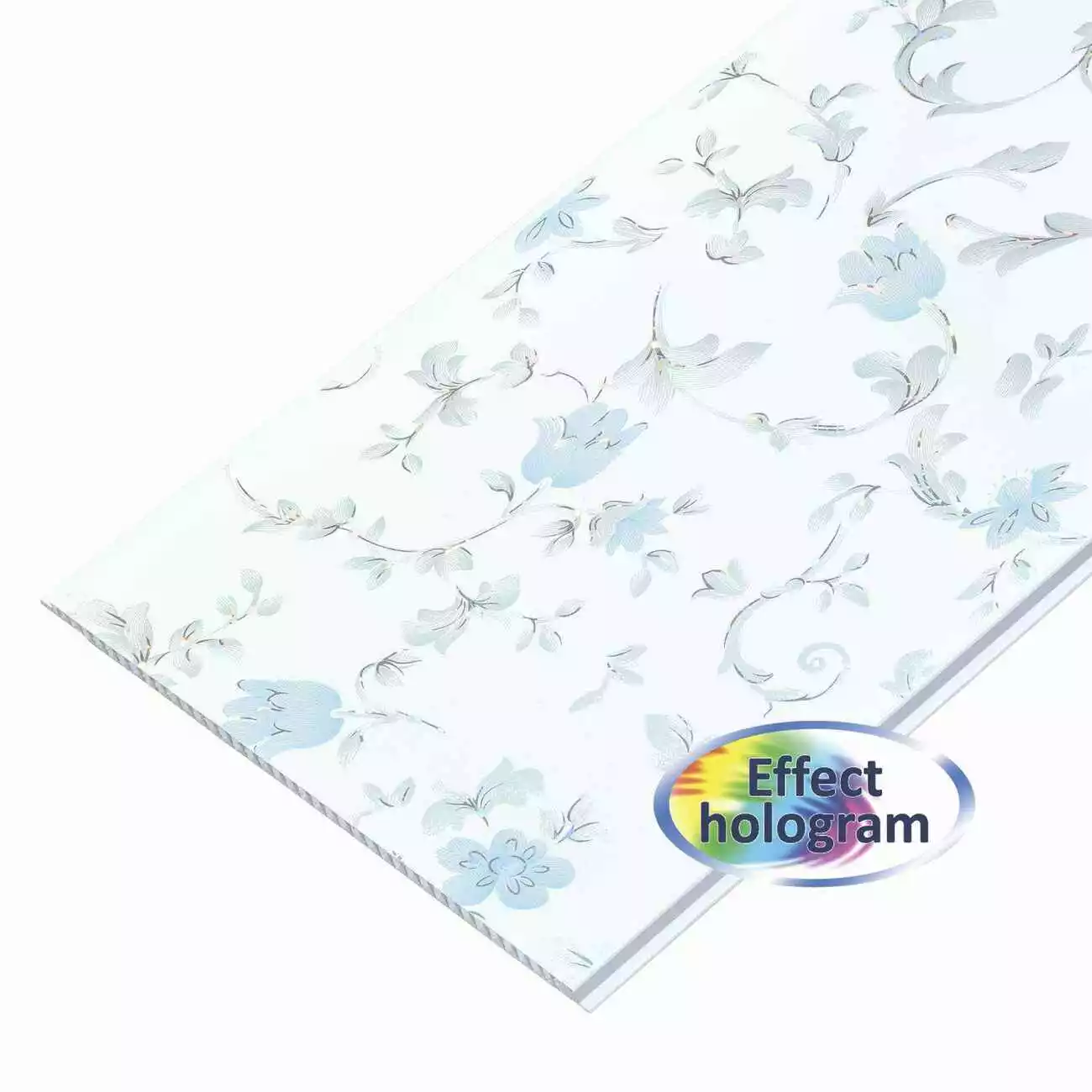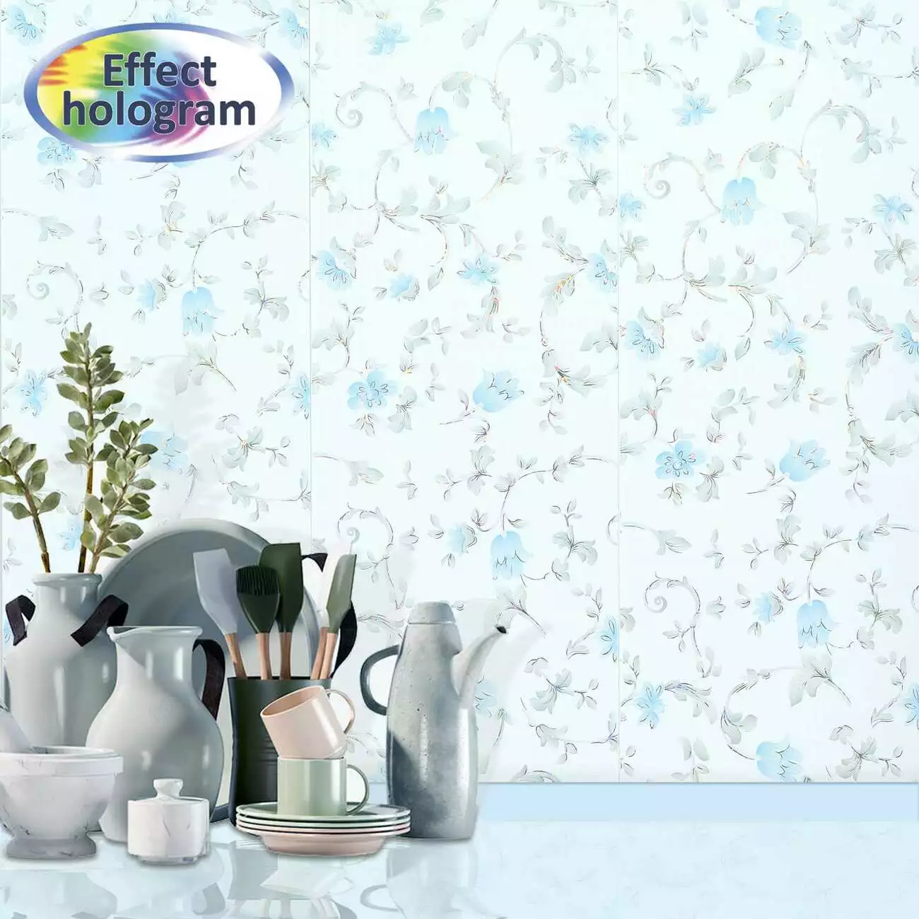 Настроение неторопливого деревенского расслабления и отдыха достигается за счет голубых цветов которые в хаотичном порядке располагаются на панелях. На их фоне шикарно будет смотреться удобное глубокое кресло, деревянная обеденная группа, старинный деревянный комод. Мягкие и нежные цвета, элегантные линии вместе образуют спокойный домашний интерьер.