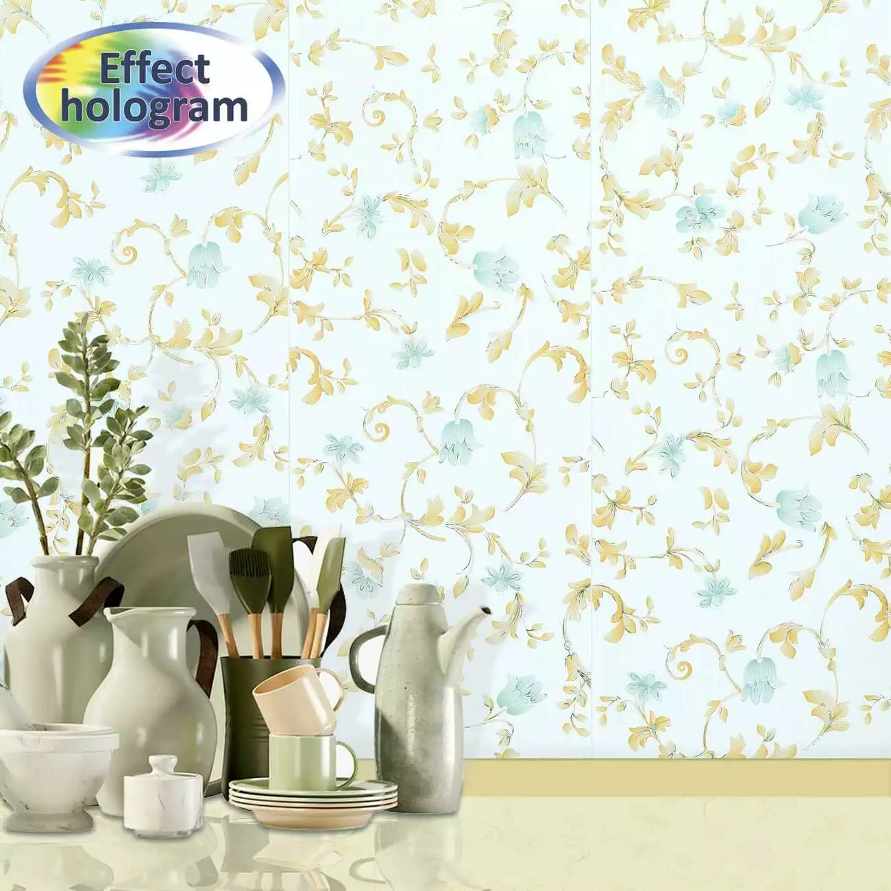 Современный акцент им добавляет технология голограммы. Переливающиеся изящные узоры из полупрозрачных цветов и листьев великолепны в оформлении жилых комнат, ванных, прихожих, кухонь. Они легко воспринимаются в скромных малогабаритных квартирах и просторных загородных домах, потому что вносят в интерьер утреннее настроение с тёплым едва уловимым ароматом ностальгии.
